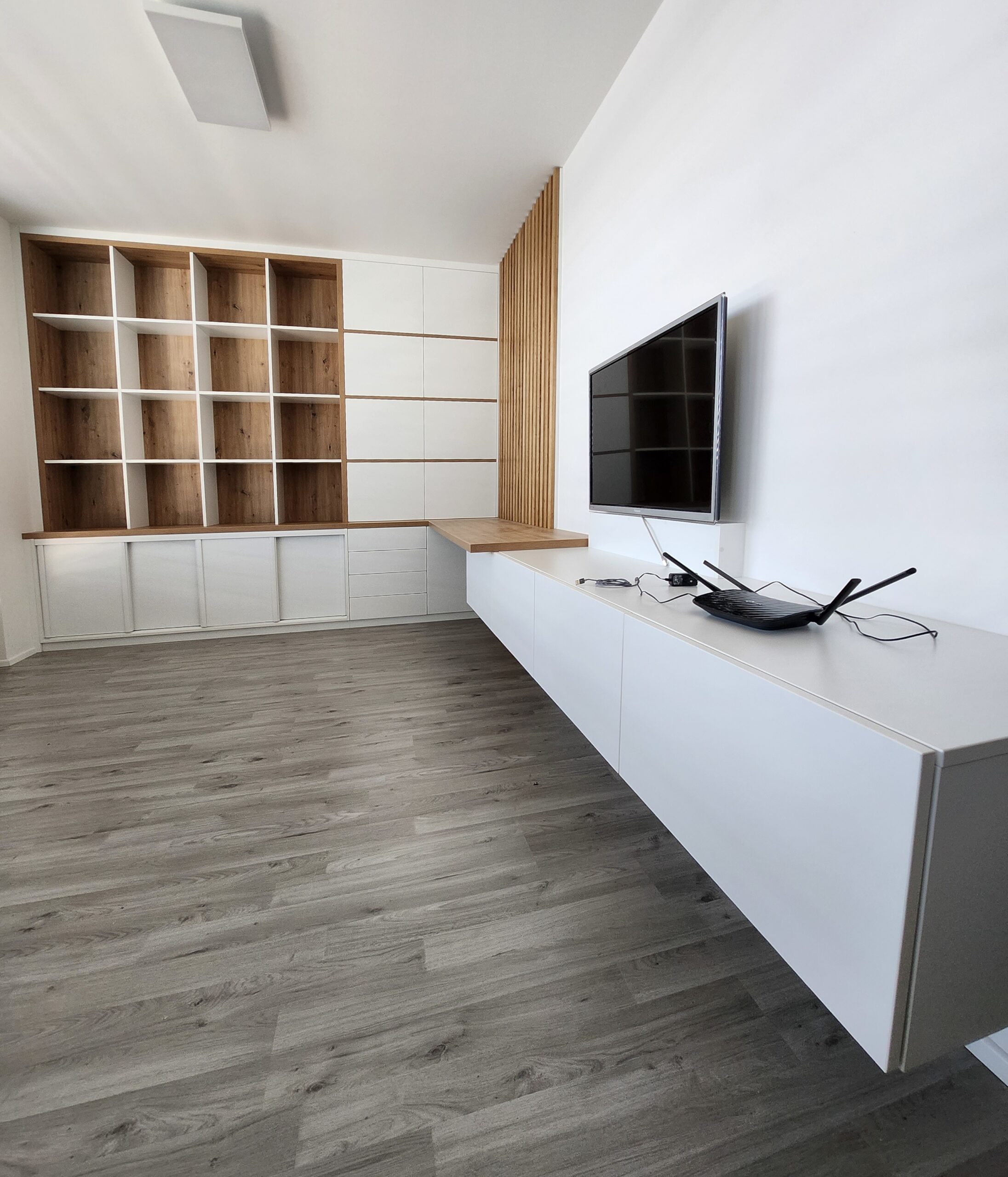 Tento projekt byl navržen s důrazem na moderní design, funkčnost a maximální využití prostoru. Cílem bylo vytvořit komfortní a elegantní prostředí odpovídající požadavkům klienta. Nábytek a interiérové prvky byly navrženy na míru s důrazem na detail a kvalitu provedení.